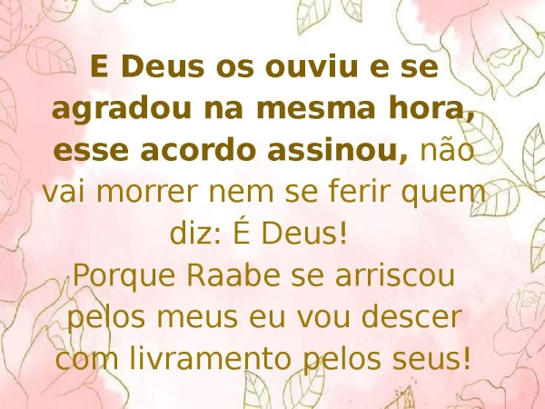 - E Deus os ouviu e se agradou na mesma hora, esse acordo assinou, não vai morrer nem se ferir quem diz: É Deus! Porque Raabe se arriscou pelos meus eu vou descer com livramento pelos seus!