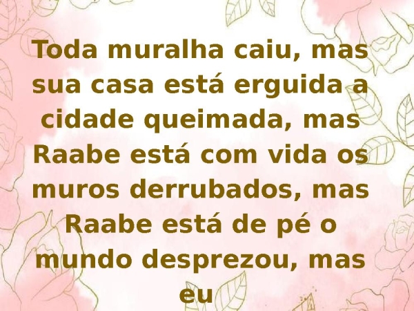 - Toda muralha caiu, mas sua casa está erguida a cidade queimada, mas Raabe está com vida os muros derrubados, mas Raabe está de pé o mundo desprezou, mas eu honrei a sua fé
