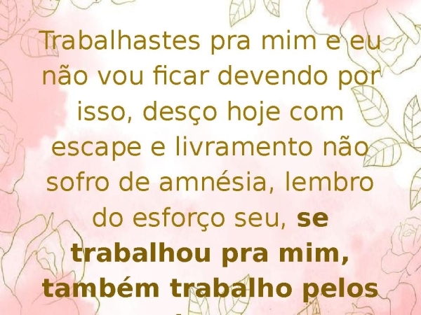 - Trabalhastes pra mim e eu não vou ficar devendo por isso, desço hoje com escape e livramento não sofro de amnésia, lembro do esforço seu, se trabalhou pra mim, também trabalho pelos teus.