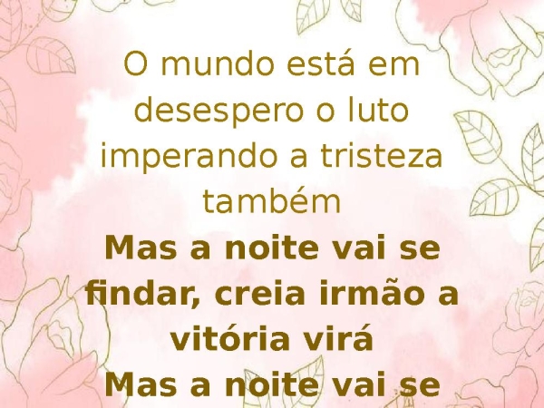 - O mundo está em desespero o luto imperando a tristeza tambémMas a noite vai se findar, creia irmão a vitória viráMas a noite vai se findar, creia irmão a vitória virá