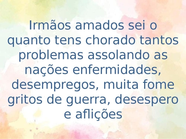 - Irmãos amados sei o quanto tens chorado tantos problemas assolando as nações enfermidades, desempregos, muita fome gritos de guerra, desespero e aflições