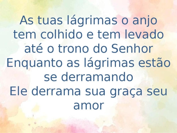- As tuas lágrimas o anjo tem colhido e tem levado até o trono do SenhorEnquanto as lágrimas estão se derramandoEle derrama sua graça seu amor