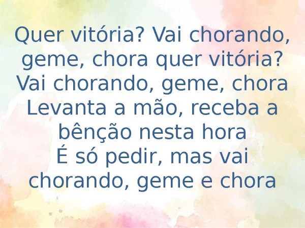 - Quer vitória? Vai chorando, geme, chora quer vitória? Vai chorando, geme, choraLevanta a mão, receba a bênção nesta horaÉ só pedir, mas vai chorando, geme e chora