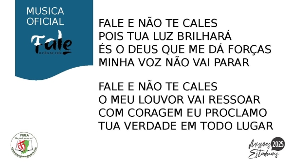 - MUSICA OFICIALFALE E NÃO TE CALESPOIS TUA LUZ BRILHARÁÉS O DEUS QUE ME DÁ FORÇASMINHA VOZ NÃO VAI PARARFALE E NÃO TE CALESO MEU LOUVOR VAI RESSOARCOM CORAGEM EU PROCLAMOTUA VERDADE EM TODO LUGAR