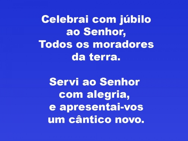 - Celebrai com júbilo ao Senhor, Todos os moradores da terra. Servi ao Senhor com alegria, e apresentai-vos um cântico novo.