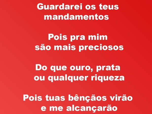 - Guardarei os teus mandamentos Pois pra mim são mais preciososDo que ouro, prata ou qualquer riquezaPois tuas bênçãos virão e me alcançarão