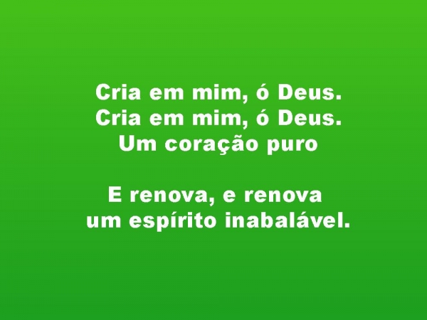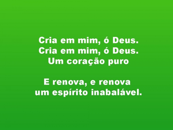 - Cria em mim, ó Deus.Cria em mim, ó Deus.Um coração puroE renova, e renova um espírito inabalável.