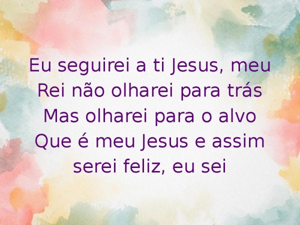 - Eu seguirei a ti Jesus, meu Rei não olharei para trásMas olharei para o alvoQue é meu Jesus e assim serei feliz, eu sei