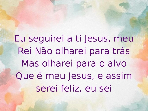- Eu seguirei a ti Jesus, meu Rei Não olharei para trásMas olharei para o alvoQue é meu Jesus, e assim serei feliz, eu sei