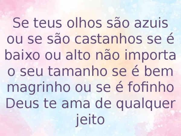 - Se teus olhos são azuis ou se são castanhos se é baixo ou alto não importa o seu tamanho se é bem magrinho ou se é fofinhoDeus te ama de qualquer jeito