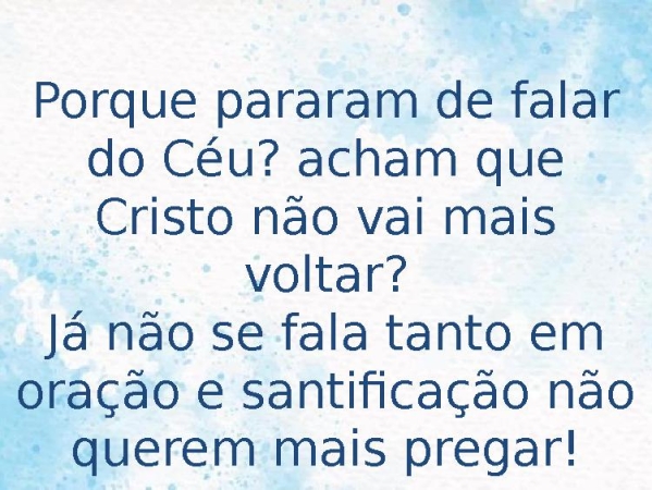 - Porque pararam de falar do Céu? acham que Cristo não vai mais voltar?Já não se fala tanto em oração e santificação não querem mais pregar!