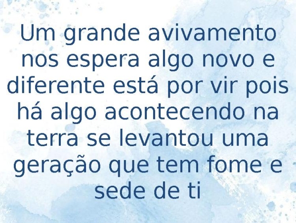 - Um grande avivamento nos espera algo novo e diferente está por vir pois há algo acontecendo na terra se levantou uma geração que tem fome e sede de ti
