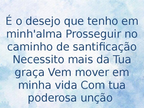 - É o desejo que tenho em minh'alma Prosseguir no caminho de santificação Necessito mais da Tua graça Vem mover em minha vida Com tua poderosa unção