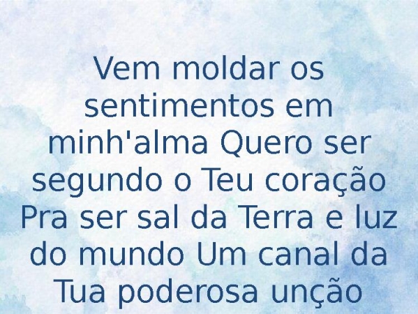 - Vem moldar os sentimentos em minh'alma Quero ser segundo o Teu coração Pra ser sal da Terra e luz do mundo Um canal da Tua poderosa unção
