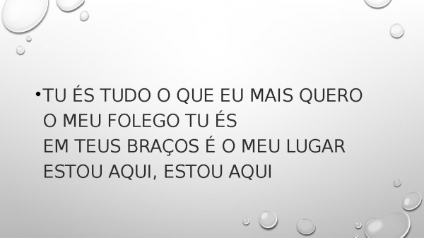 - Tu És tudo o que eu mais queroO meu folego tu ÉsEm Teus braços é o meu lugarEstou aqui, estou aqui