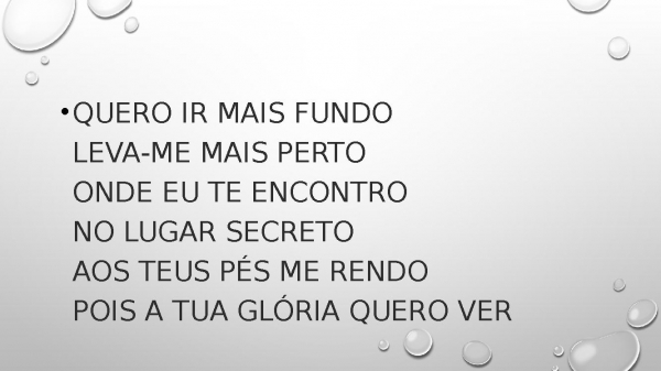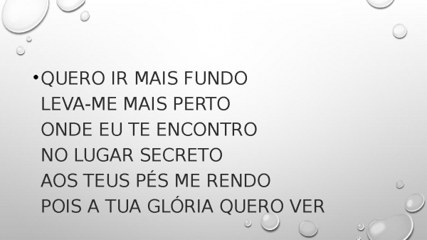 - Quero ir mais fundoLeva-me mais pertoOnde eu Te encontrono Lugar SecretoAos Teus pés me rendoPois a Tua Glória quero ver