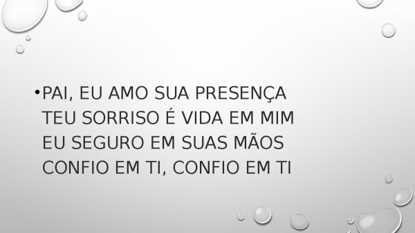 - Pai, eu amo sua presençaTeu sorriso é vida em mimEu seguro em suas mãosConfio em Ti, confio em Ti