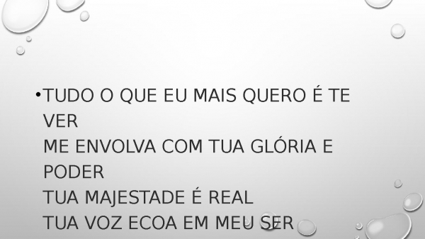- Tudo o que eu mais quero é Te verMe envolva com Tua Glória e PoderTua Majestade é realTua voz ecoa em meu ser