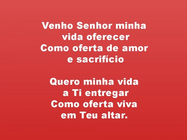 - Venho Senhor minha vida oferecerComo oferta de amor e sacrifícioQuero minha vida a Ti entregarComo oferta viva em Teu altar.