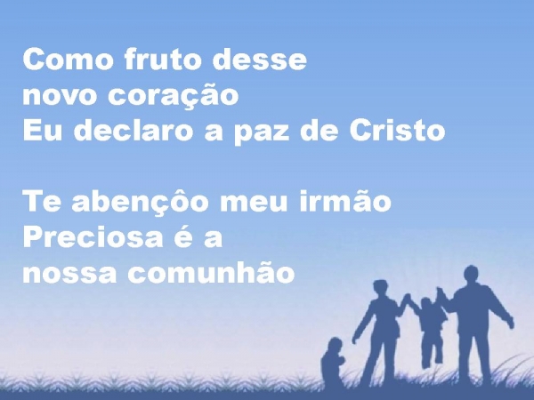- Como fruto dessenovo coraçãoEu declaro a paz de Cristo Te abençôo meu irmãoPreciosa é anossa comunhão