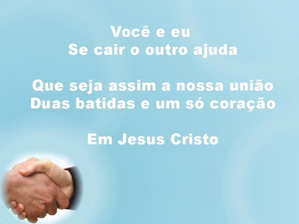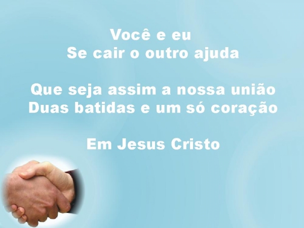 - Você e eu Se cair o outro ajudaQue seja assim a nossa uniãoDuas batidas e um só coraçãoEm Jesus Cristo