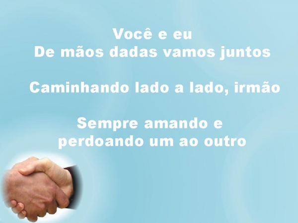 - Você e euDe mãos dadas vamos juntos Caminhando lado a lado, irmãoSempre amando e perdoando um ao outro