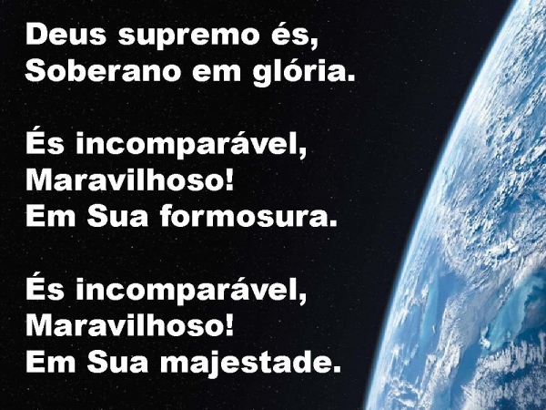 - Deus supremo és,Soberano em glória.És incomparável, Maravilhoso!Em Sua formosura.És incomparável,Maravilhoso!Em Sua majestade.