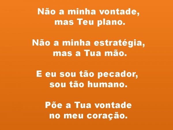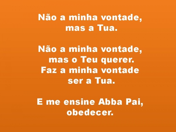 - Não a minha vontade, mas a Tua.Não a minha vontade, mas o Teu querer.Faz a minha vontade ser a Tua.E me ensine Abba Pai, obedecer.