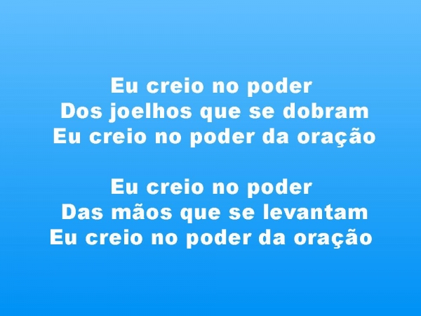 - Eu creio no poder Dos joelhos que se dobramEu creio no poder da oraçãoEu creio no poder Das mãos que se levantamEu creio no poder da oração