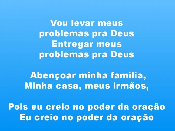 - Vou levar meus problemas pra Deus Entregar meus problemas pra Deus Abençoar minha família,Minha casa, meus irmãos, Pois eu creio no poder da oração Eu creio no poder da oração