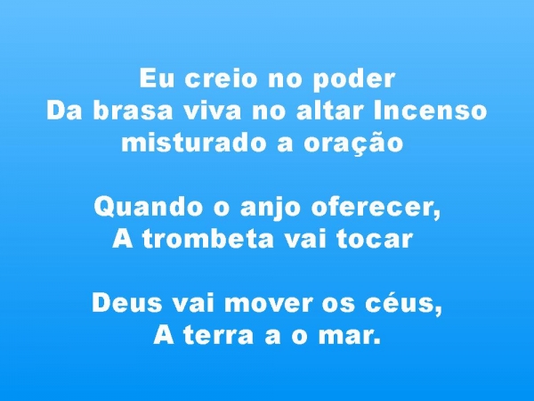 - Eu creio no poderDa brasa viva no altar Incenso misturado a oração Quando o anjo oferecer,A trombeta vai tocar Deus vai mover os céus,A terra a o mar.