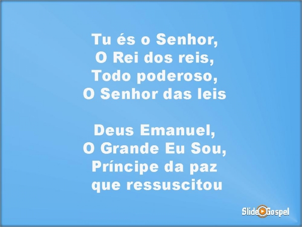 - Tu és o Senhor,O Rei dos reis,Todo poderoso,O Senhor das leisDeus Emanuel,O Grande Eu Sou,Príncipe da paz que ressuscitou