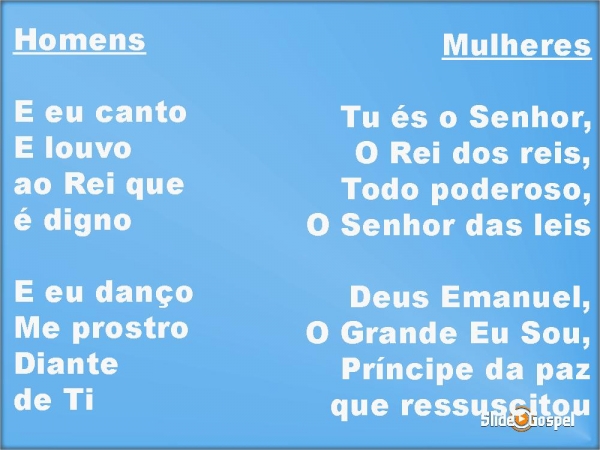 - HomensE eu cantoE louvoao Rei que é dignoE eu dançoMe prostroDiante de Ti MulheresTu és o Senhor,O Rei dos reis,Todo poderoso,O Senhor das leisDeus Emanuel,O Grande Eu Sou,Príncipe da paz que ressuscitou