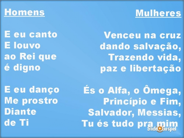 - HomensE eu cantoE louvoao Rei que é dignoE eu dançoMe prostroDiante de Ti MulheresVenceu na cruzdando salvação,Trazendo vida, paz e libertaçãoÉs o Alfa, o Ômega,Princípio e Fim,Salvador, Messias,Tu és tudo pra mim