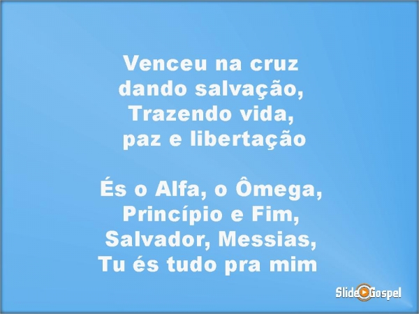 - Venceu na cruzdando salvação,Trazendo vida, paz e libertaçãoÉs o Alfa, o Ômega,Princípio e Fim,Salvador, Messias,Tu és tudo pra mim