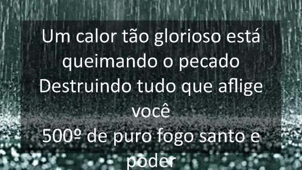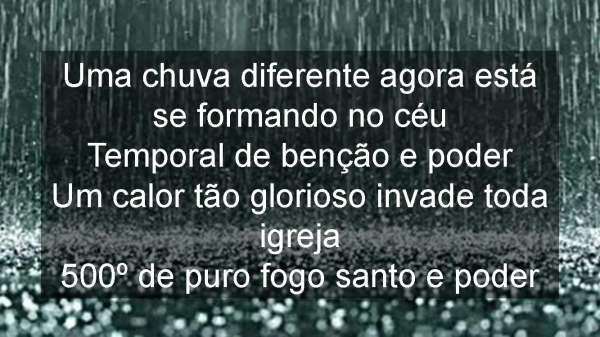 - Uma chuva diferente agora está se formando no céuTemporal de benção e poderUm calor tão glorioso invade toda igreja500º de puro fogo santo e poder