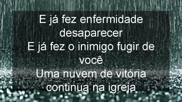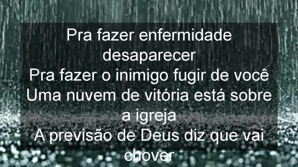 - Pra fazer enfermidade desaparecerPra fazer o inimigo fugir de vocêUma nuvem de vitória está sobre a igrejaA previsão de Deus diz que vai chover