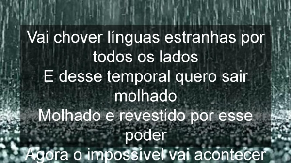 - Vai chover línguas estranhas por todos os ladosE desse temporal quero sair molhadoMolhado e revestido por esse poderAgora o impossível vai acontecer