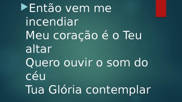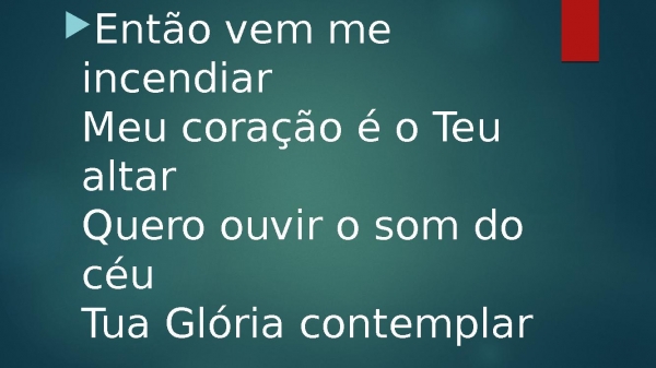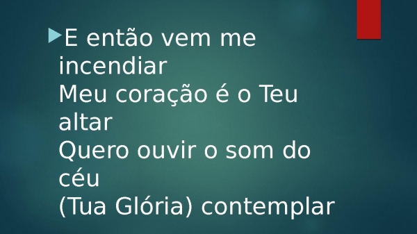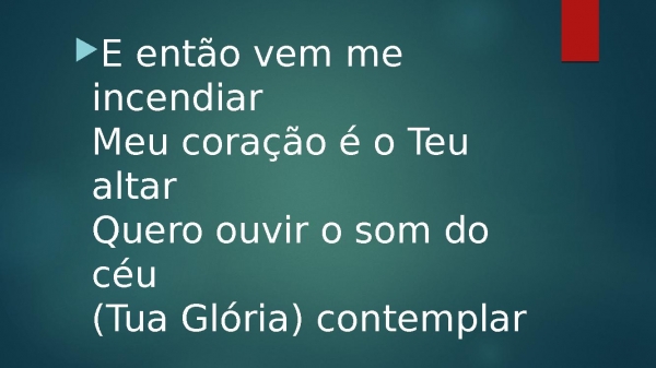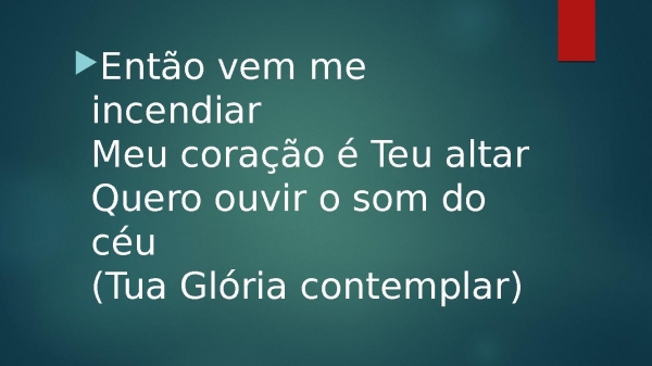 - Então vem me incendiarMeu coração é Teu altarQuero ouvir o som do céu(Tua Glória contemplar)