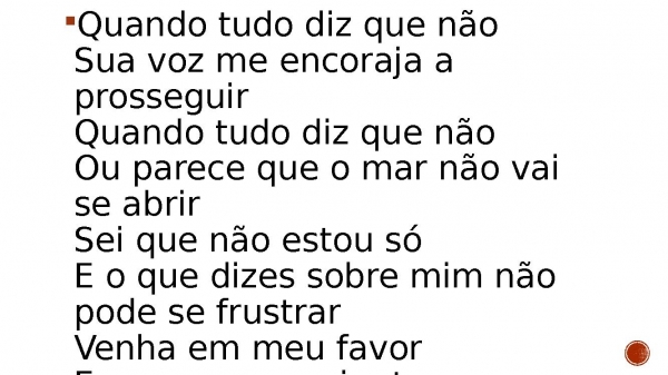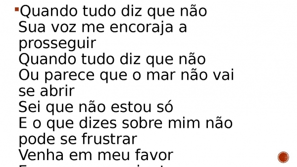 - Quando tudo diz que nãoSua voz me encoraja a prosseguirQuando tudo diz que nãoOu parece que o mar não vai se abrirSei que não estou sóE o que dizes sobre mim não pode se frustrarVenha em meu favorE cumpra em mim teu querer