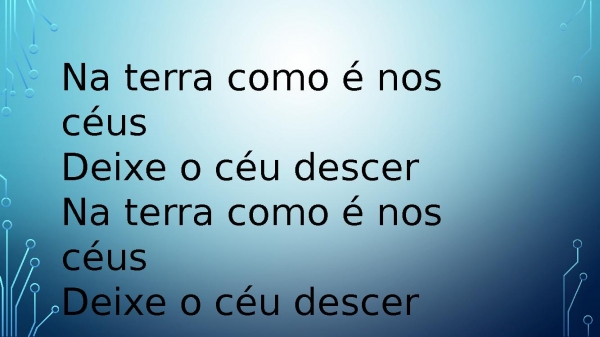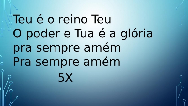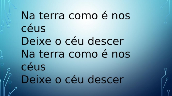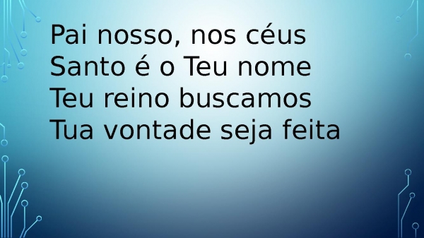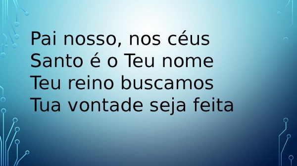 - Pai nosso, nos céusSanto é o Teu nomeTeu reino buscamosTua vontade seja feita