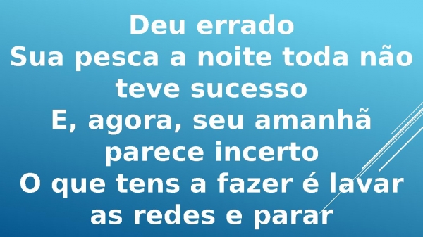 - Deu erradoSua pesca a noite toda não teve sucessoE, agora, seu amanhã parece incertoO que tens a fazer é lavar as redes e parar
