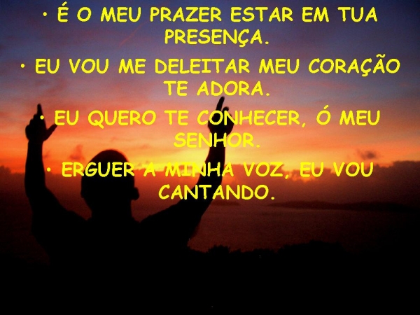 - É O MEU PRAZER ESTAR EM TUA PRESENÇA.EU VOU ME DELEITAR MEU CORAÇÃO TE ADORA.EU QUERO TE CONHECER, Ó MEU SENHOR.ERGUER A MINHA VOZ, EU VOU CANTANDO.