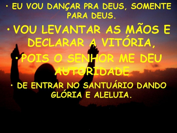 - EU VOU DANÇAR PRA DEUS, SOMENTE PARA DEUS.VOU LEVANTAR AS MÃOS E DECLARAR A VITÓRIA,POIS O SENHOR ME DEU AUTORIDADEDE ENTRAR NO SANTUÁRIO DANDO GLÓRIA E ALELUIA.