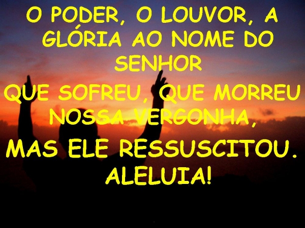 - O PODER, O LOUVOR, A GLÓRIA AO NOME DO SENHORQUE SOFREU, QUE MORREU NOSSA VERGONHA, MAS ELE RESSUSCITOU. ALELUIA!