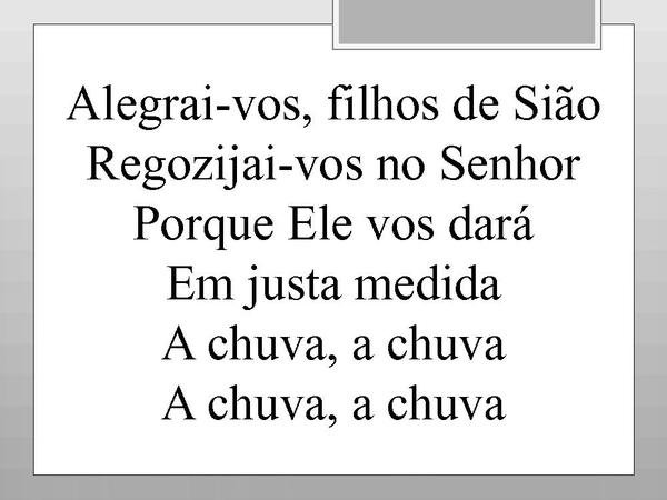 - Alegrai-vos, filhos de SiãoRegozijai-vos no SenhorPorque Ele vos daráEm justa medidaA chuva, a chuvaA chuva, a chuva