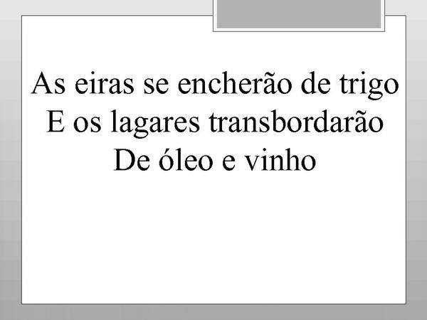 - As eiras se encherão de trigoE os lagares transbordarãoDe óleo e vinho