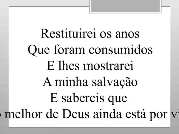 - Restituirei os anosQue foram consumidosE lhes mostrareiA minha salvaçãoE sabereis que o melhor de Deus ainda está por vir