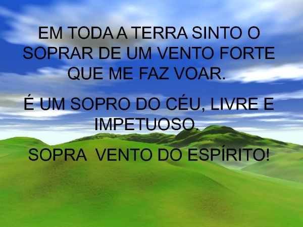 - EM TODA A TERRA SINTO O SOPRAR DE UM VENTO FORTE QUE ME FAZ VOAR. É UM SOPRO DO CÉU, LIVRE E IMPETUOSO. SOPRA VENTO DO ESPÍRITO!