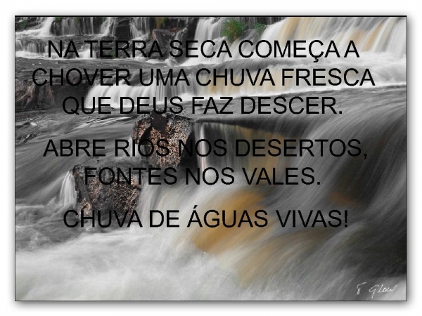 - NA TERRA SECA COMEÇA A CHOVER UMA CHUVA FRESCA QUE DEUS FAZ DESCER ABRE RIOS NOS DESERTOS, FONTES NOS CHUVA DE ÁGUAS VIVAS NA TERRA SECA COMEÇA A CHOVER UMA CHUVA FRESCA QUE DEUS FAZ DESCER. ABRE RIOS NOS DESERTOS, FONTES NOS VALES. CHUVA DE ÁGUAS VIVAS!